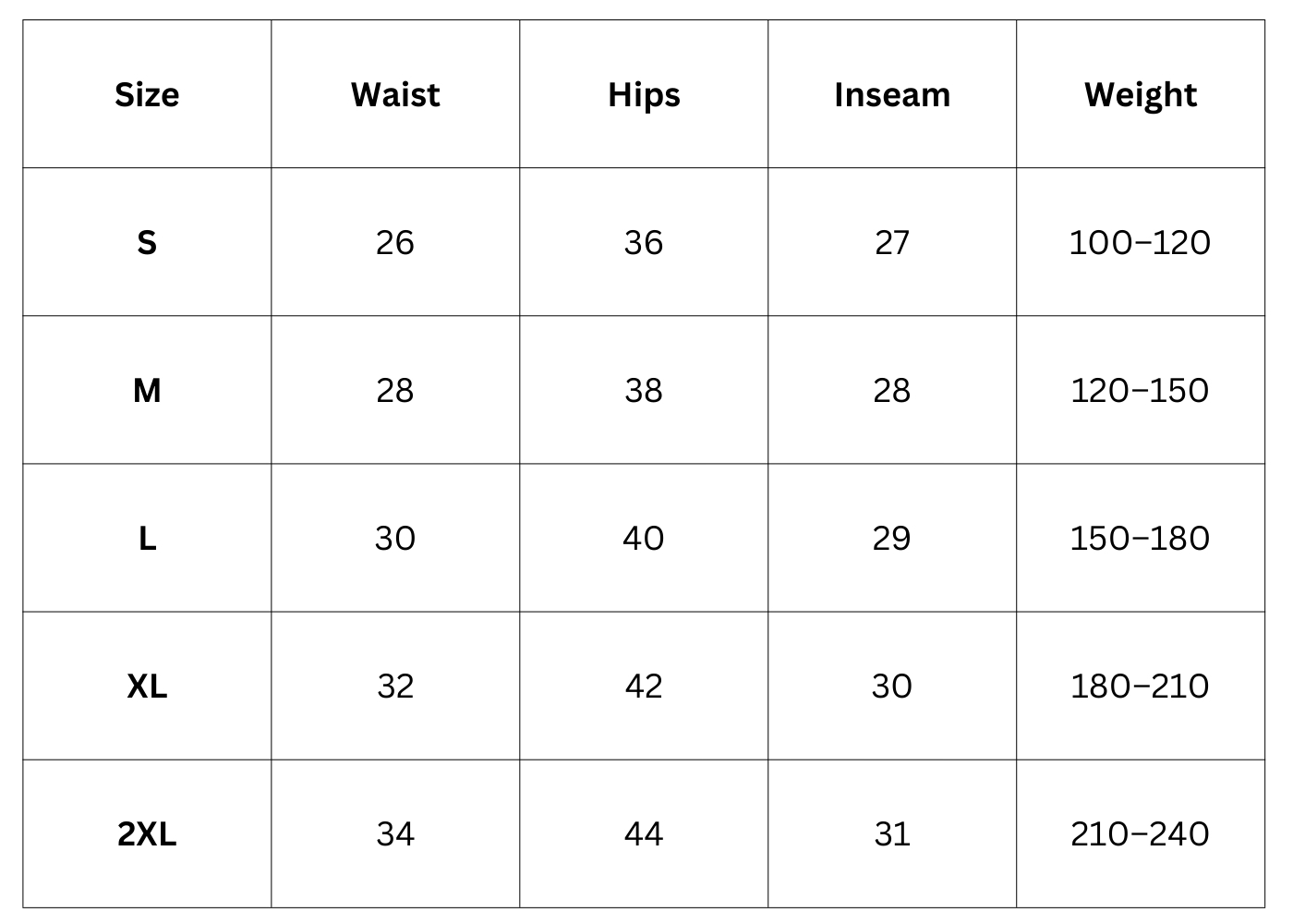Size Chart (Inches):
