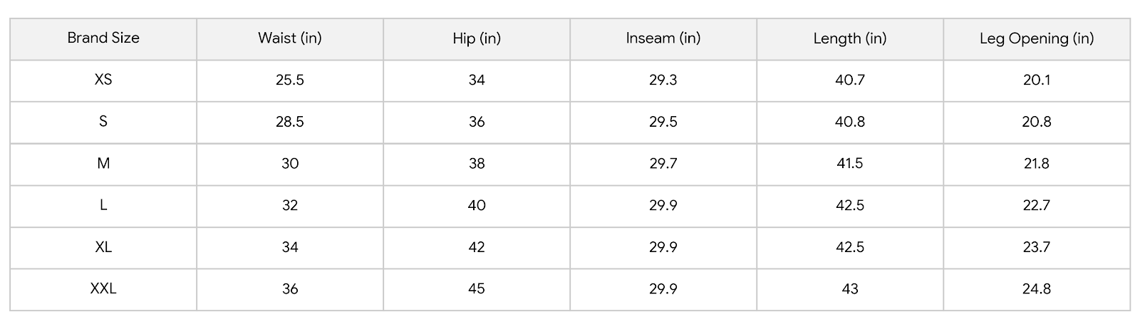 Size Chart (inches):